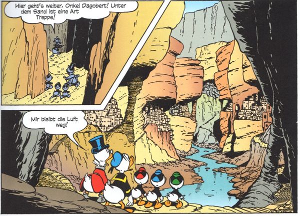 „Ich habe mir Dagobert nie als… Millionär vorgestellt, der sein Geld durch die Ausbeutung anderer Menschen verdient hat… Ich habe absichtlich versucht, es so aussehen zu lassen, als ob Onkel Dagobert das meiste seines Geldes… in den Tagen verdient hat, als man noch in die Berge gehen und Gold finden konnte.“