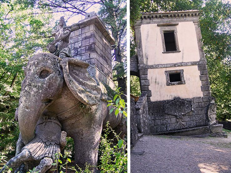 Zu den phantasievollen Konstruktionen, die den Garten bevölkern, gehören die Statuen des Zerberus, des Pegasus, eines Elefanten mit einer Burg auf dem Rücken und einem römischen Soldaten im Rüssel, einer Schildkröte, die eine Frau auf ihrem Panzer trägt, eines riesigen Mannes – möglicherweise Herkules -, der seinen Feind brutal in zwei Hälften reißt, und eines Drachen, der mit zwei Löwen kämpft. Es gibt auch einen niedrigen Turm, das sogenannte „Schiefe Haus“, das auf einem schiefen Felsen erbaut wurde und dem Kardinal Cristoforo Madruzzo, einem Freund Orsinis, gewidmet ist.