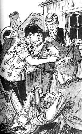 Arthurs zehnter und letzter Roman der Reihe beginnt damit, dass die Jungs auf einer Auktion einen alten Reisekoffer ersteigern – der Originaltitel The Mystery of the Auction Trunk (Das Geheimnis des Auktionskoffers) ist treffend, wenn auch nicht gerade aufregend – und von einer mysteriösen Dame sofort 30 Dollar geboten bekommen. Doch die Jungs wollen nicht verkaufen, und so zieht sie frustriert von dannen. Als sie mit ihrem Kauf zum Schrottplatz zurückkehren, stellen sie fest, dass die Truhe den Erwartungen entspricht: Wie auf dem Deckel versprochen, gehört sie einem Zauberer und enthält eine Menge Kostüme, einige magische Utensilien und den titelgebenden sprechenden Schädel: