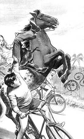 »Dir hat es ja richtig den Atem verschlagen«, sagte Peter. Sie ging nicht darauf ein, sondern starrte Justus an. »Weißt du nicht, daß Pferde im Straßenverkehr Vorrang haben?« fragte sie.
