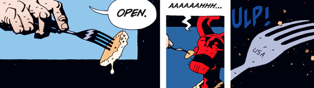 Pancakes sind zwar mit unseren Pfannkuchen verwandt, aber doch ganz anders: Sie sind süß, fluffig und üppig. Im Film wird deutlich, dass Hellboy (Ron Perlman) große Mengen Pancakes serviert bekommt. Er liebt diese Dinger. Dies wurde erstmals in einer zweiseitigen Geschichte enthüllt, die ursprünglich in „Dark Horse Presents Annual 1999” veröffentlicht und später in „Hellboy Band 5: Die rechte Hand des Schicksals” abgedruckt wurde. Die deutschen Ausgaben von Cross Cult sind leider auch hier nur schwarz-weiß, weshalb sich ein Griff zum Original lohnt.